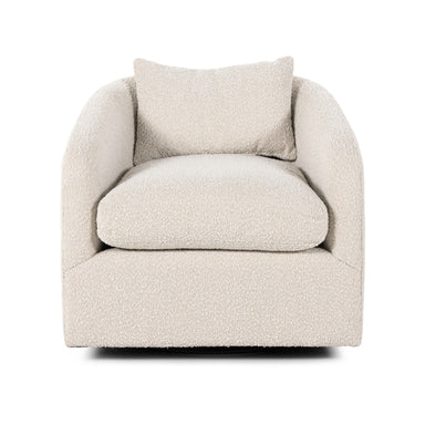 This is a modern barrel-style swivel chair with a low-profile design and a cozy, textured bouclé fabric in an off-white or cream tone. It features ...